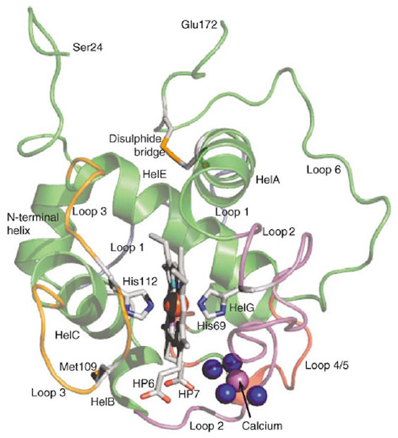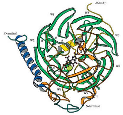 Ghosh, M., Anthony, C., Harlos, K., Goodwin, M.G. & Blake, C.C.F. (1995). The refined structure of the quinoprotein methanol dehydrogenase from Methylobacterium extorquens at 1.94Å. Structure 3, 177- 187.