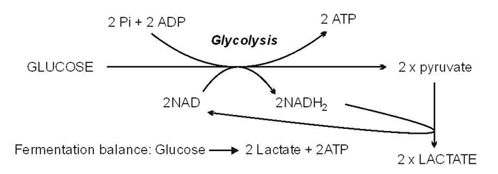 Fermentation balance: Glucose → 2 Lactate + 2 ATP |