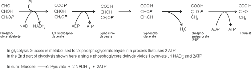 Glucose → 2 pyruvate + 2NADH2 + 2ATP Then 2 pyruvate + 2 NADH2 → 2 Lactate