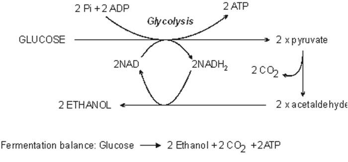 2. Ethanol fermentation. In yeast (Saccharomyces) Glucose is oxidised by glycolysis to pyruvate