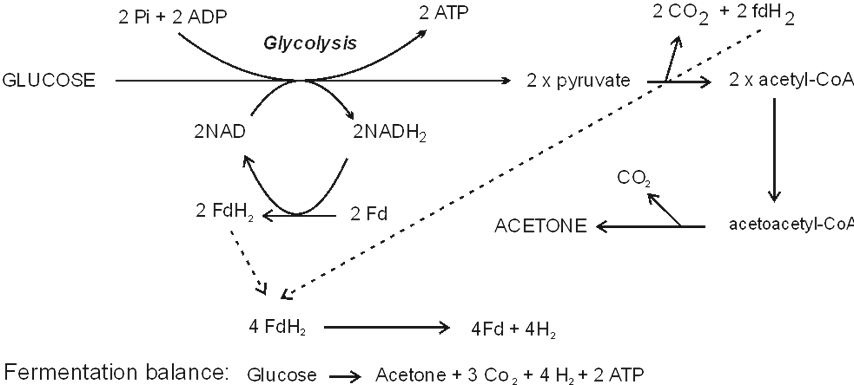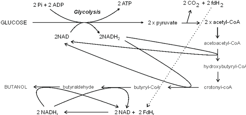 Fermentation balance: Glucose → Butanol + 2 CO2 + 2ATP |