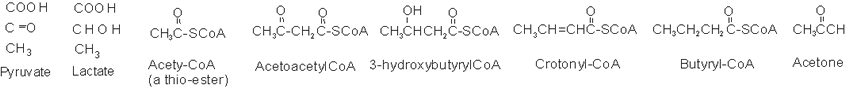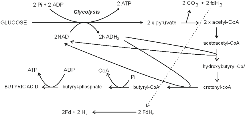 Fermentation balance: Glucose → Butyric acid + 2 CO2 + 2 H2 + 3ATP |