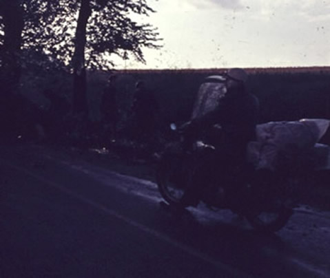 I recently met up with David after about 48 years. These are pictures taken from his long-lost slides, scanned and cleaned up with Photoshop. I had recently started my PhD in the University of Reading where I was friends with David who had spent much of his life with his parents in Portugal. He asked a favour: that I give him a lift to visit his mother. After I agreed he told me she was in Portugal, so I then agreed more enthusiastically. We went on my single cylinder 350cc BSA. I had bought this a few months earlier for £25 on the day i passed my driving test on my NSU 50cc Quickly. The bike went well but before we reached Portugal the spring in the gear return spring lever [right foot] broke and so had to be manipulated with an elastic cord and complicated footwork for the rest of the journey. Usual running speed was 55 - 65mph. |