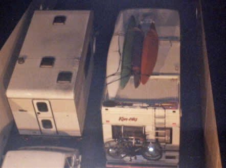 | First year with our kayaks on new roof rack; note the trolleys (made by Clive and me | |