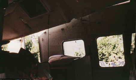 | In 1994 we had a puncture (rear offside)on a motorway on our way toward Grenoble. After a valiant attempt to keep control we faced the oncoming traffic and crashed onto our side. No one was badly hurt although we were taken to hospital for Clive to have stitches for a cut over his eye. The RAC looked after us. We came home in a hired car. Clive and I went out with a hired Transit to collect all that we could - especially the kayaks. The insurance company paid us the same for the van as we had paid for it six years earlier. These pictures show Merlin after the rescue truck had delivered him to the scrapyard. | |